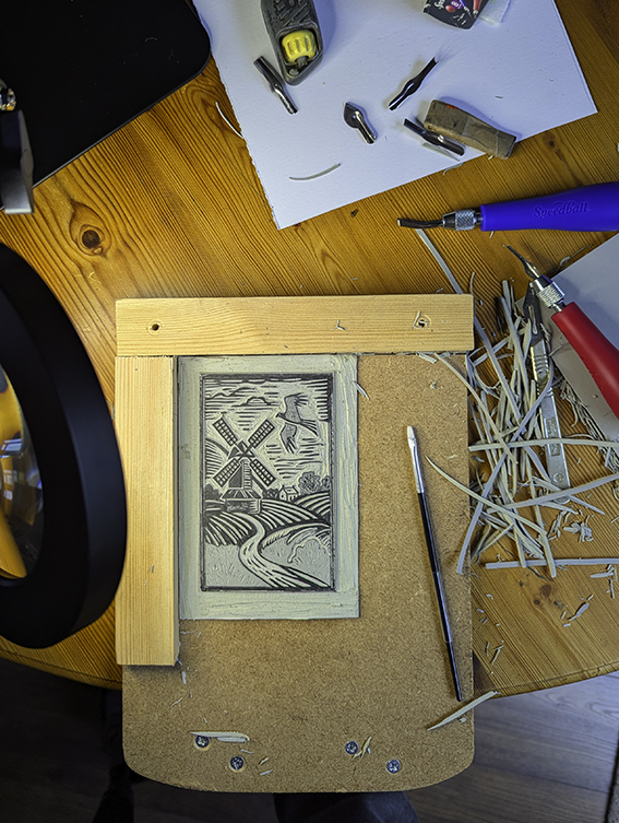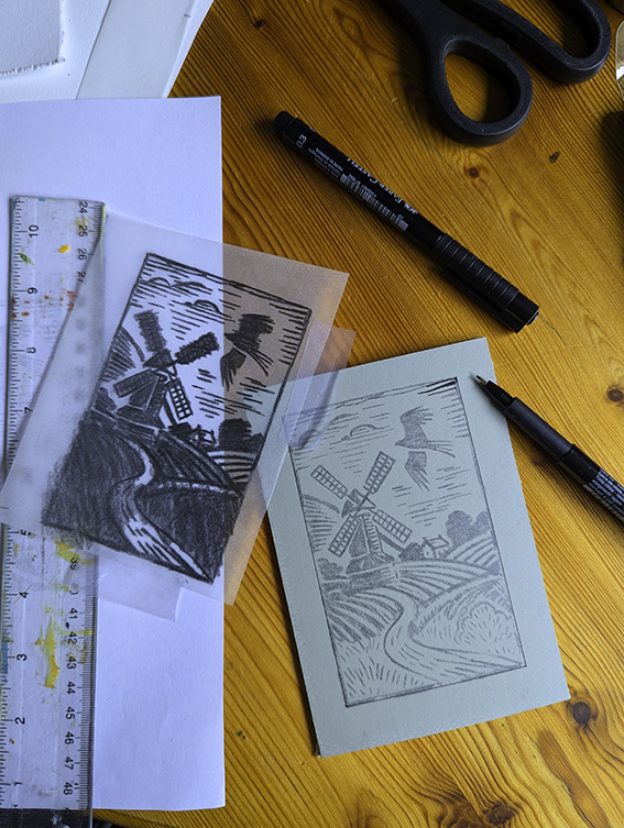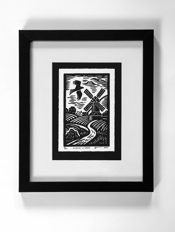 This is the linocut process for my Fine Art Prints of Pitstone Windmill. This is all done by hand, sketched onto lino board, then cutout and printed. Each Print is individual. Printed on Fine art paper, I have a Limited Edition of 50 Prints. Which can be purchased framed or unframed.